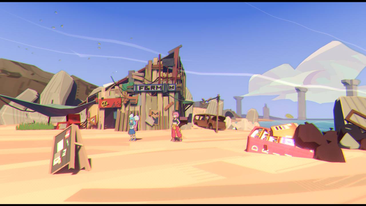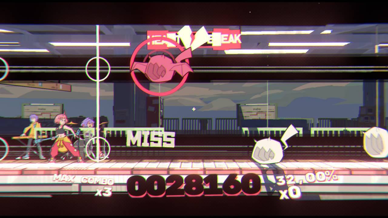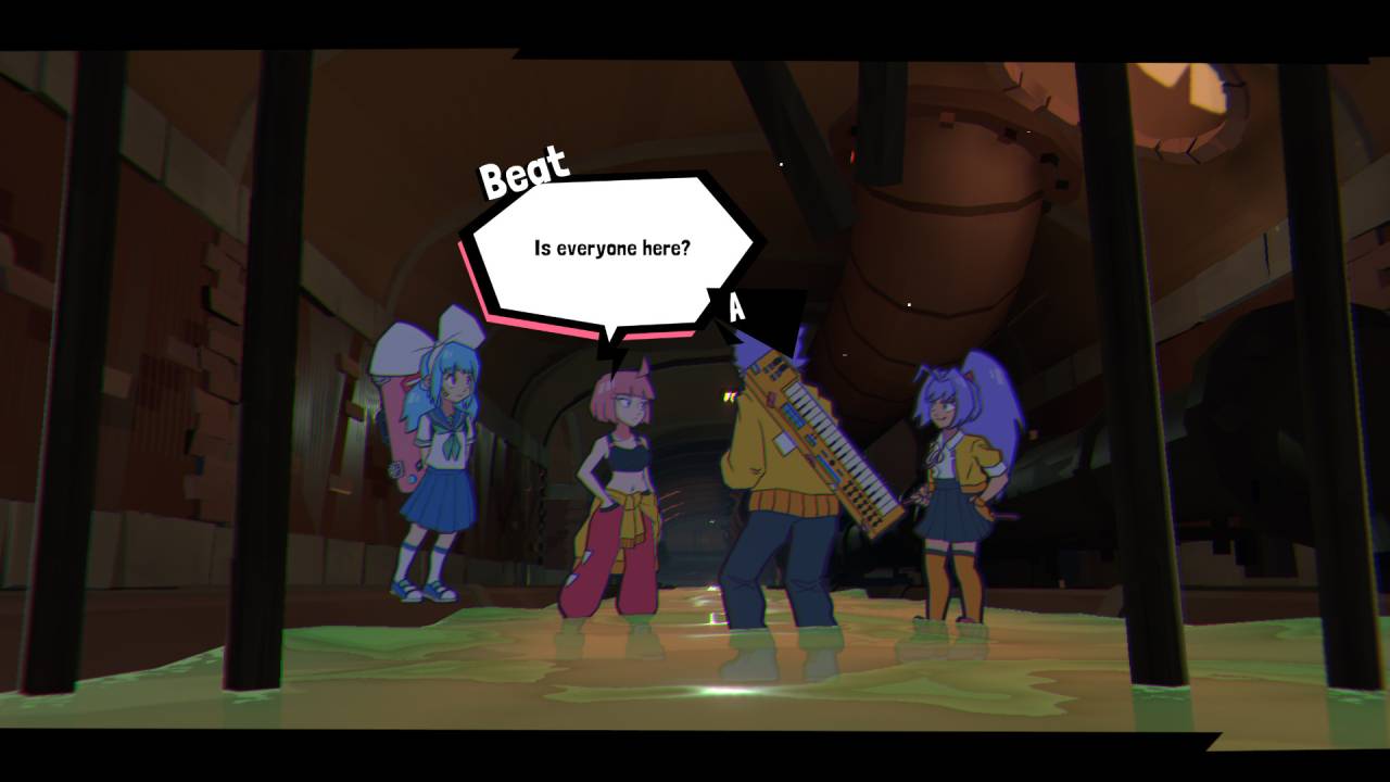 Проходить сюжетный режим поначалу тяжеловато. В графический стиль а-ля старый околоанимешный мультсериал с VHS влюбляешься сразу же — очаровательные двухмерные персонажи бегают по ярким 3D-локациям. Но на каждом шагу возникает ощущение, что разработчики тянут время. То диалоги слишком долгие, то вас вынуждают чего-то ждать и слоняться из угла в угол, то нужно слишком много времени тратить на пробежки от одного края карты к другому. Иногда неясно, чего от тебя хотят и в какую сторону держать путь, и теряешь несколько минут, если ошибся. А главное, до финальной погони в первой главе вообще нет сюжетных сцен с ритм-механиками.
