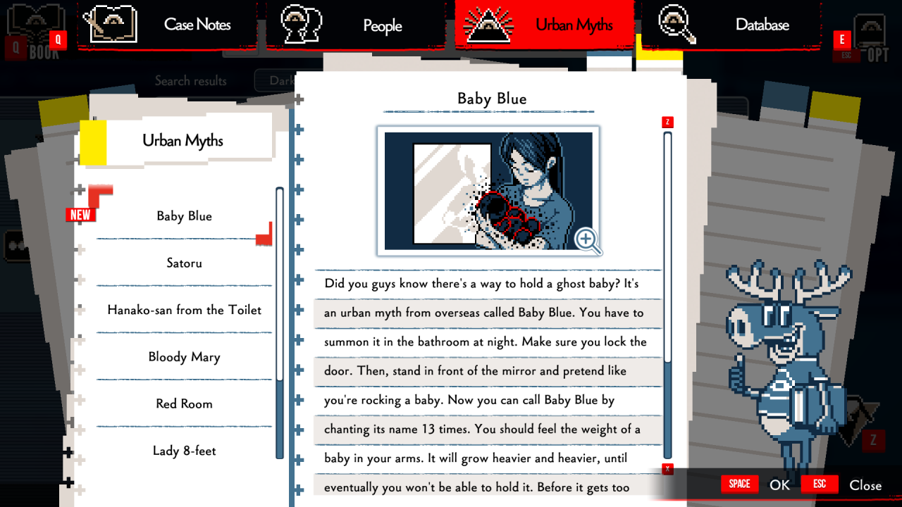 На месте выясняется, что подруга Адзами стала жертвой городской легенды по прозвищу Мужик Под Кроватью. Задавая наводящие вопросы и собирая улики, героиня находит свойственные этому мифу черты: существо появляется из-под кровати, носит с собой топор и исчезает после включения света. Когда гипотез будет достаточно, Адзами приступает к следующей части расследования — Мэгурия часто вторгается в мысли героини и помогает сосредоточиться на фактах, но внимательные игроки справятся и без его помощи. А если нет, можно открыть дневник и перечитать собранную ранее информацию.
