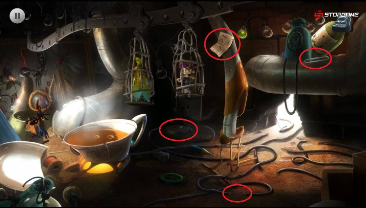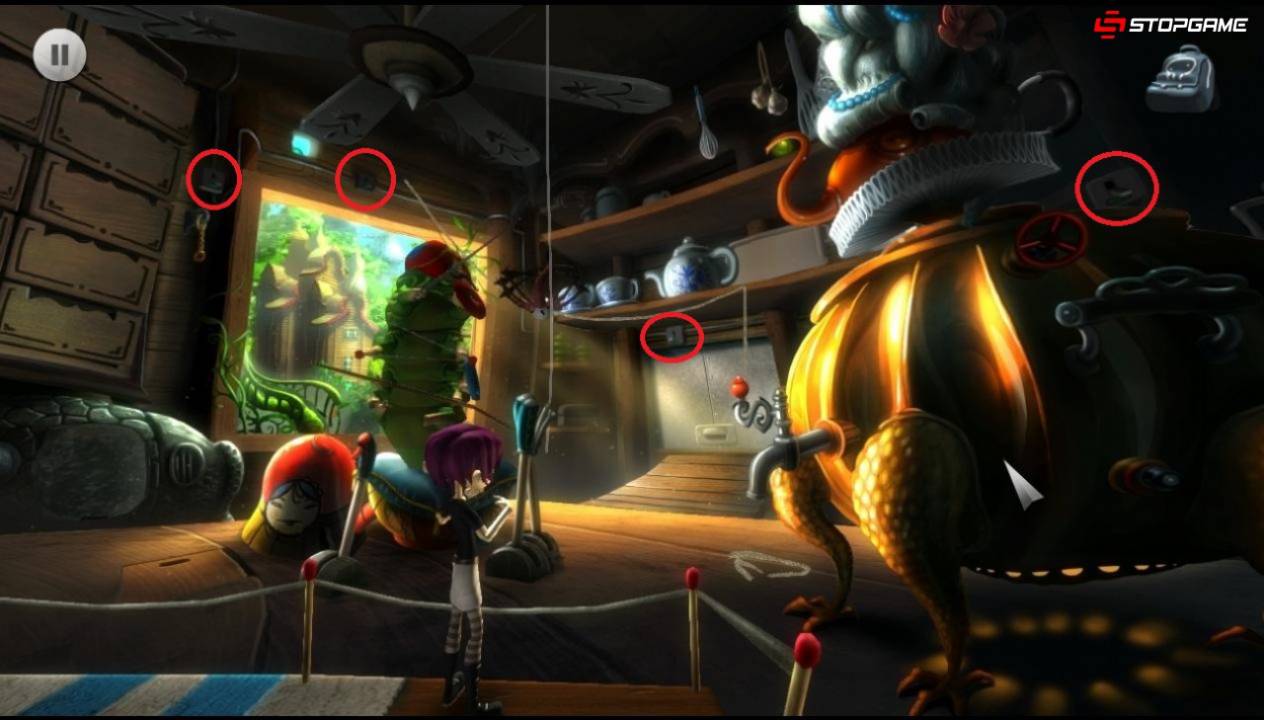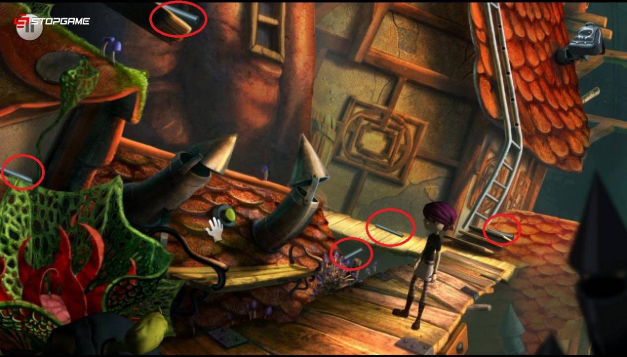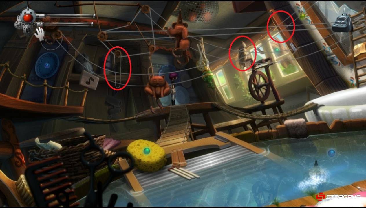 Проходим до конца в левую сторону и применяем дудочку на бельё в корзине. Управляя двумя веревками, переносим крючки с фигурками котов на правую сторону, затем примерно к центру. При столкновении крючков, спичку сорвутся вниз. Делаем таким образом, чтобы обе спички упали сразу или хотя бы с небольшим временным промежутком. Быстро спускаемся вниз и оттягиваем одну из спичек к уже находящимся у края трем спичкам. Акулабобр будет постоянно поедать спички, поэтому всегда нужно действовать без промедлений. Собрав пять спичек, скрепляем их паутиной из инвентаря. На получившемся плоту переплываем на другую сторону, использовав рукоятку щетки в качестве весла. Забираем вторую часть амулета, спускаемся по лестнице и, вернувшись обратно, покидаем локацию.