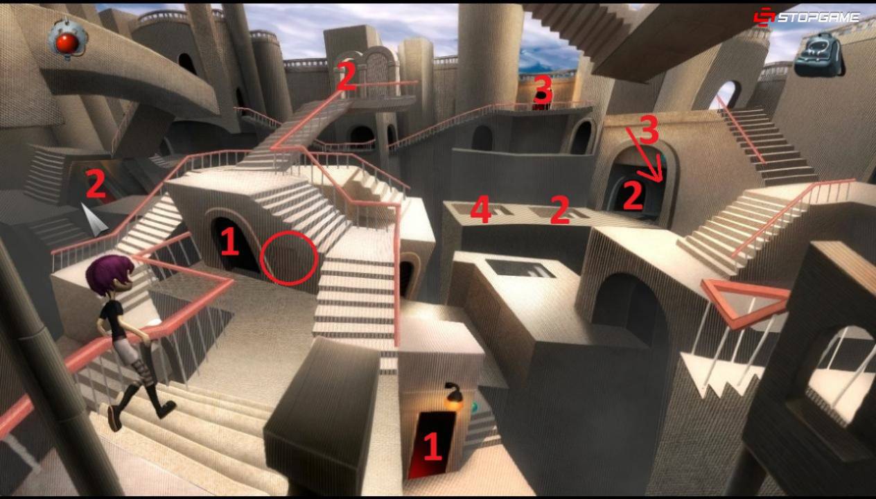 Проходим на крышу здания, а затем к башне. Переключаем флажок, пройдя мимо него. Вступаем на прибывший подъемник и поднимаемся на следующий уровень. Сходим с правой стороны. Проходим мимо флажка туда-сюда, направив его в левую сторону. Поднимаемся на подъемнике на следующий уровень. Сходим с левой стороны, поднимаемся на самый верх по правой лестнице, проходим через флажок и спускаемся к среднему флажку по левой лестнице. Проходим мимо флажка и спускаемся по правой лестнице. Подъемник завис на одном месте. Через него перебираемся на правую сторону, спускаемся по лестнице и проходим туда-сюда через флажок. Поднимаемся по лестнице, обратно перебираемся на левую сторону и проходим через нижний флажок к левой лестнице. Поднимаемся к среднему флажку, проходим через него и спускаемся по правой лестнице. Дождавшись подъемника, снова перебираемся на правую сторону, спускаемся вниз и стоим возле лестницы. Как только подъемник окажется на нашем уровне, кликаем по нему и поднимаемся к верхушке башни. Если не удалось попасть на подъемник с первой попытки, то возвращаемся к лестнице и снова проделываем то же самое, что описывалось в предыдущем предложении. Сходим с правой стороны, взаимодействуем с кристаллом и получаем новую способность – левитация.