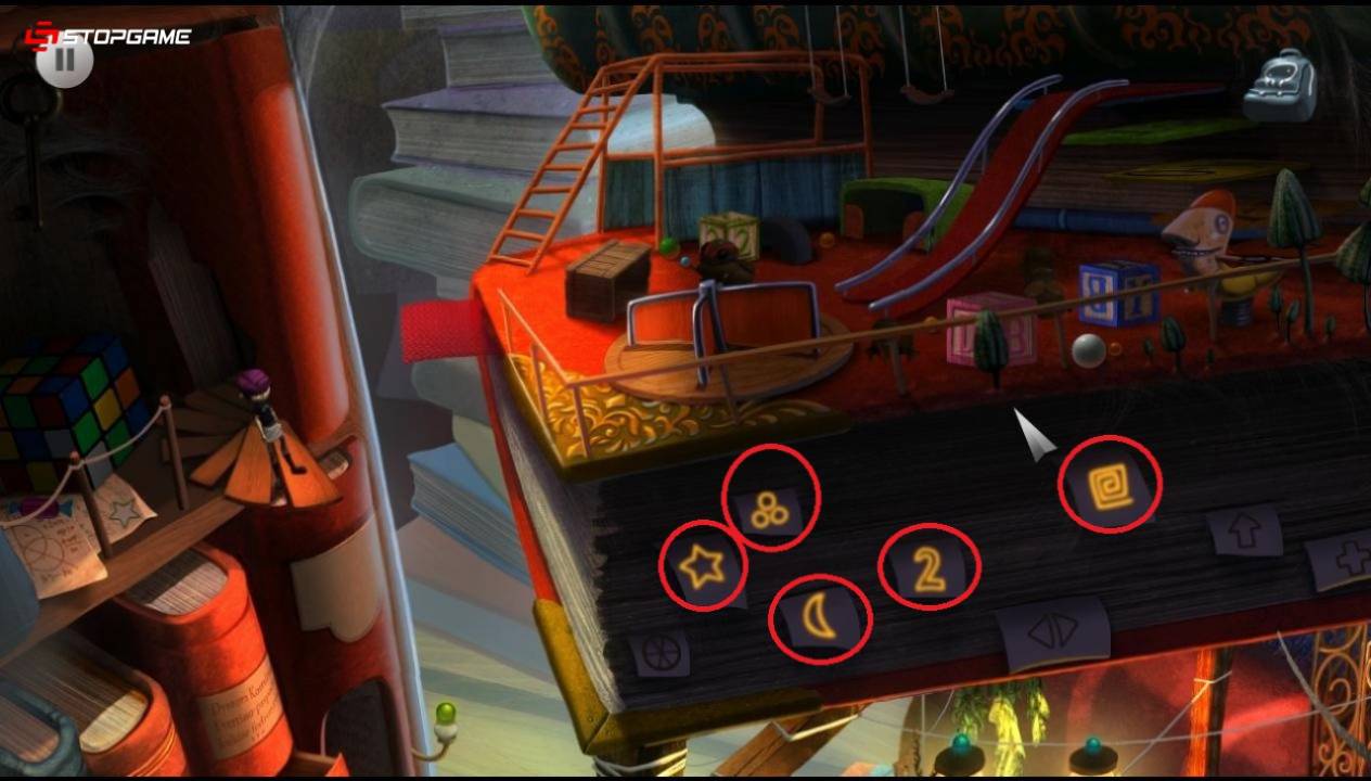 Выдвигаем ящик из первой же книги возле прохода и забираем конфету. Проход приведет нас на верхний этаж, где за кубик-рубиком обнаружим вторую конфету. На толстенной книге расположилась игровая площадка книжных червей. Сбоку находятся закладки, кликаем на те, что указаны в изображении. Когда раскроется мостик, перебираемся на площадку и играем с детенышами червя. Периодически они будут выглядывать и нам нужно успевать щелкать по ним. По одному отправляем их на обед. Затем спускаемся сами и общаемся с мамочкой-червем, которая в качестве награды передаст нам ключ. Отпираем им калитку с правой стороны и поднимаемся наверх.