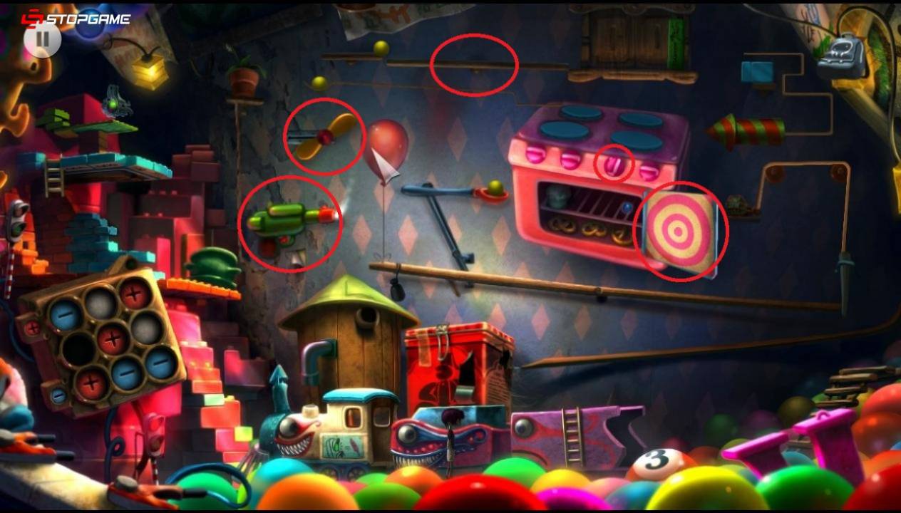 Чтобы состав двинулся с места, нужно заправить локомотив и загрузить второй вагончик. Для заполнения локомотива, расставляем предметы согласно первому изображению. Приподнимаем дорожку, чтобы шар сразу скатился вниз, и направляем пистолет на шар.
