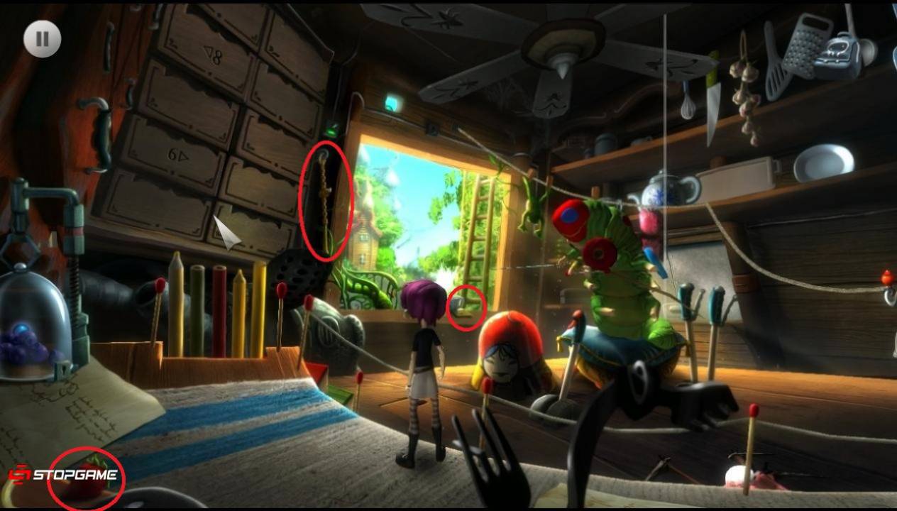 Возвращаемся в локацию «Кухня» и переходим в следующую локацию, щелкнув по проходу рядом с лестницей на заднем плане. Прорастаем растение, взбираемся по нему и забираем страницу дневника. Рядом находится одна из трех пробок – кликаем по ней и подбираем. Еще одна пробка находится на самом дереве. Извлекаем ее и тем самым освобождаем синего муравья. Взаимодействуем с последней пробкой, которая расположена слева от часов.