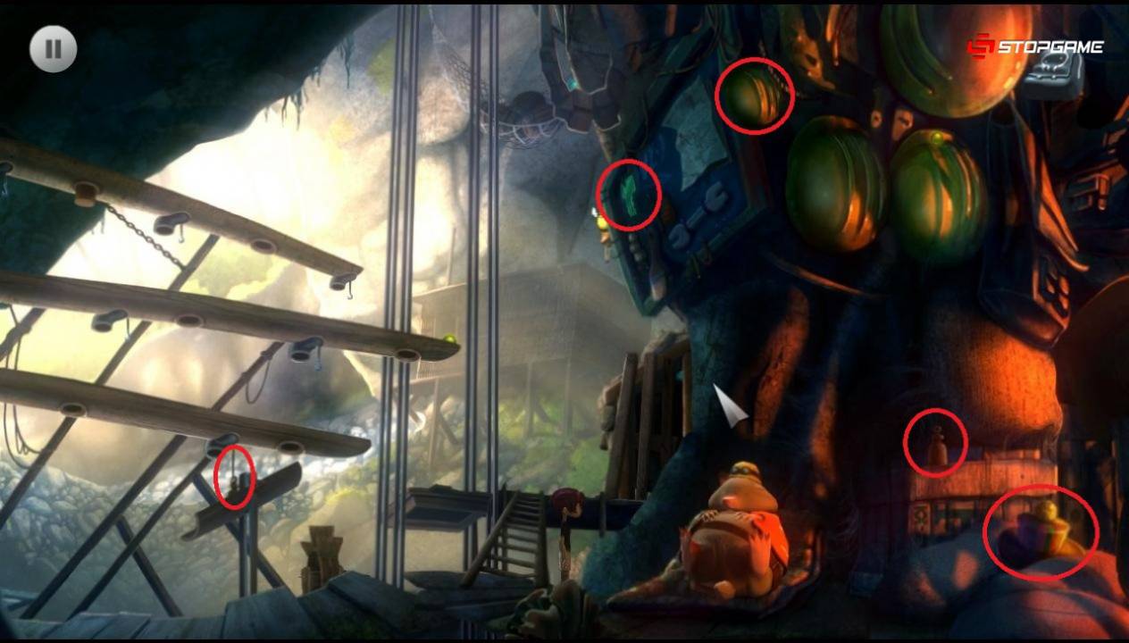 С вешалки забираем жилет, а с верхних полок – грузик и рукоятку. Идем в правую сторону и добираемся до отдыхающего на лежаке крота-строителя. Над ним находится ключ, но забрать его мы сможем только после того, как принесем бочку с медом. Справа от крота находятся шляпа и второй грузик, а сверху – каска. Слева расположены желоба. На нижнем и самом коротком из них закреплен третий грузик – забираем его. Также меняем положение самого желоба, наклонив его в правую сторону.