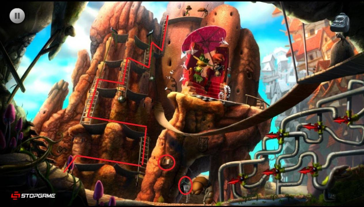Поговорим с термитом-стражником. Чтобы попасть в сад, необходимо получить разрешение. Опускаем левую лестницу и по ней поднимаемся наверх. Поднимаемся еще выше по правой лестнице. Стягиваем груз со следующей лестницы и поднимаем вверх нижнюю лестницу. Залезаем по ней, стягиваем груз, который удерживает боковую лестницу. Груз из инвентаря закрепляем на лестницу посередине. Переходим по мостику и входим в пещеру. Забираем с бельевой веревки одежду с красно-зелеными полосками, спускаемся по лестнице и переключаем рычаг.