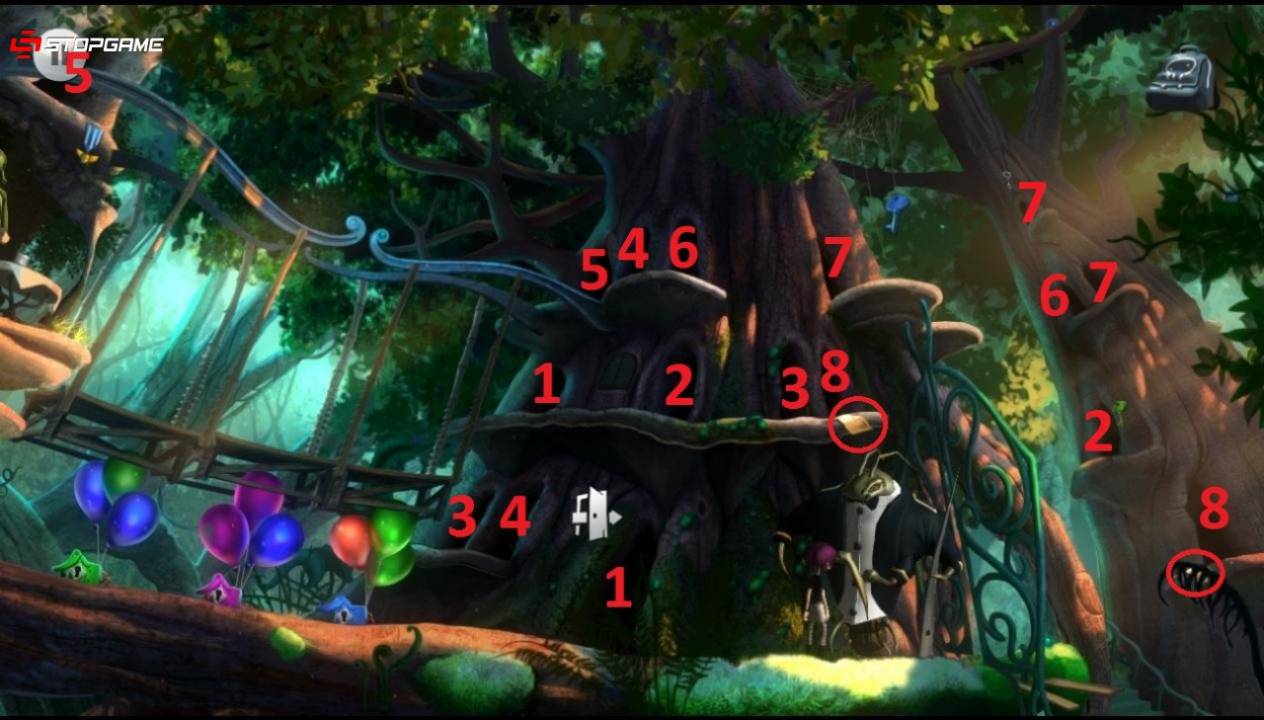 Идем через проходы в дереве указанные в изображении и забираем ключи синего и зеленого цветов. С помощью них отпираем соответственно замки синего и зеленого цветов. Возвращаемся к третьему проходу и подбираем фиолетовый ключ, которым отпираем фиолетовый замок. Идем через первый проход, переходим по мостику и общаемся с зложуком. Он попросит наполнить его кружку кипятком. Отправляемся в локацию «Кухня», идем направо и наполняем кружку из инвентаря кипятком из самовара. Возвращаемся к зложуку и отдаем ему кружку с напитком. Активируем рычаг слева от него, идем через проход «5» и забираем медаль. Добираемся до седьмого прохода, через него поднимаемся наверх и забираем серебряный ключ. Спустившись вниз, передаем медаль таракану и проходим через открывшиеся ворота.