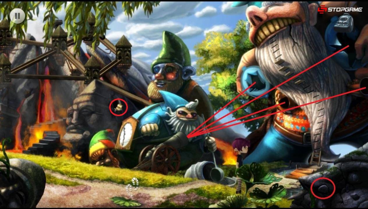 Отправляемся в локацию «Дерево». Отдаем кукушке клубнику из инвентаря и ждем, когда она оставит червяка поблизости. Подбираем его и возвращаемся к жабе. Отдаем жабе червяка и забираем жемчужину. Вставляем серебряный ключ из инвентаря в замочную скважину гнома на заднем плане. Идем через открывшийся проход между гномами.