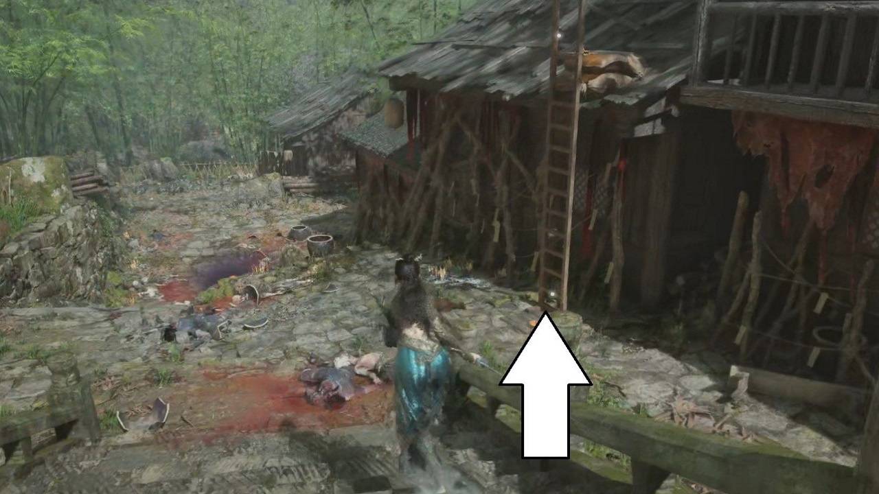 Но представим, что вы используете лестницу. Поднимитесь по лестнице, а потом — по второй. Это приведёт вас к небольшому мосту, по которому можно перейти на другую сторону. Возьмите алый фонариковый фрукт, посмотрите вниз и увидите патрулирующего местность разбойника. Нам нужно пойти в правую сторону, поэтому спрыгните и убейте врага, а затем идите направо. Вы найдёте ещё одну лестницу, ведущую вниз, где отдыхает солдат. Убейте его и подберите с земли 3 метательных ножа. Пока что не спешите спускаться, поэтому не обращайте внимания на лестницу и откройте ближайшую дверь. Вас тут же атакует заражённый житель. Убейте его и заберите семя изумрудного лотоса. Далее нужно подняться по лестнице снаружи дома, но сначала пройдите до конца тропы, чтобы найти ещё один дом с 5 метательными ножами. Удивительно, но внутри нет врагов.