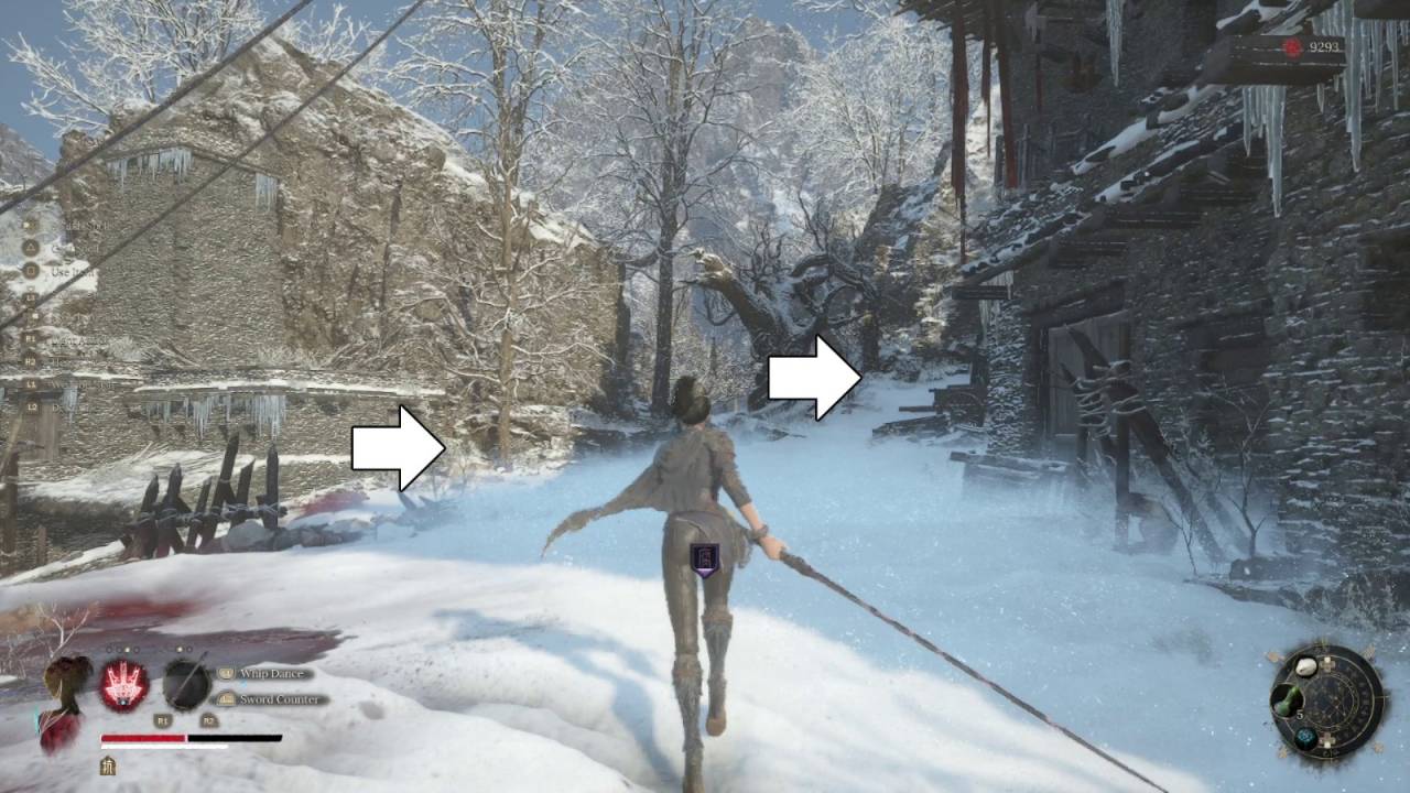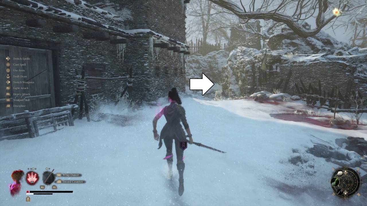 Спуститесь по лестнице на уровень земли. Вместо того чтобы идти прямиком к шпилю, следуйте вверх по тропе. Осторожно — мины! У подножия лестницы держитесь левой стороны, потому что сверху на вас покатится валун. После поднимитесь, убейте мутантов и разбойника. Наверху справа — фонариковый фрукт. Спуститесь по склону, в центре тропы стоит гончая, но будьте внимательны: за стеной слева спрятана ещё одна. Ещё один разбойник спрыгнет с крыши справа. Если войти в арку впереди, вы увидите двух разбойников. Один стучит в дверь — можно поболтать с местным жителем, но без наград.