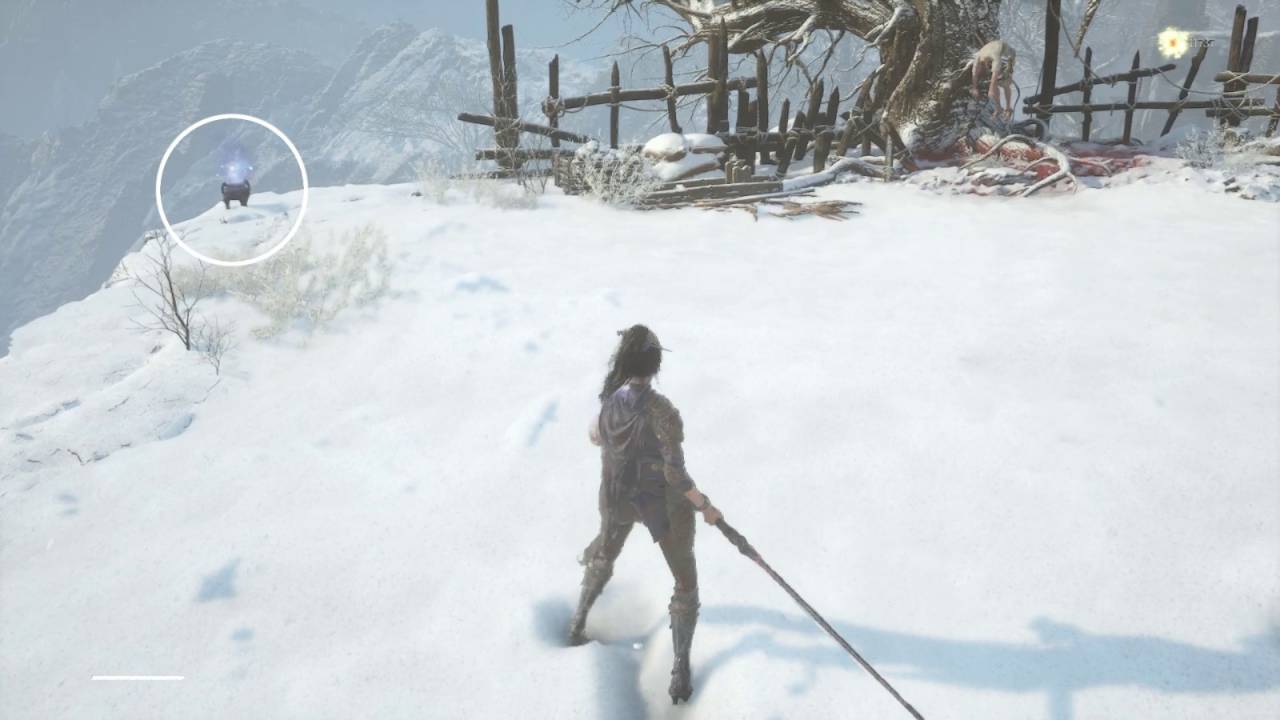 С деревянной платформы на краю обрыва заберите огненный горшок. Платформа обрушится, и вы упадёте прямо на печать рядом со святилищем «Пещера мёртвых душ». С помощью быстрого перемещения вернитесь к святилищу «Окрестности Облачного шпиля».