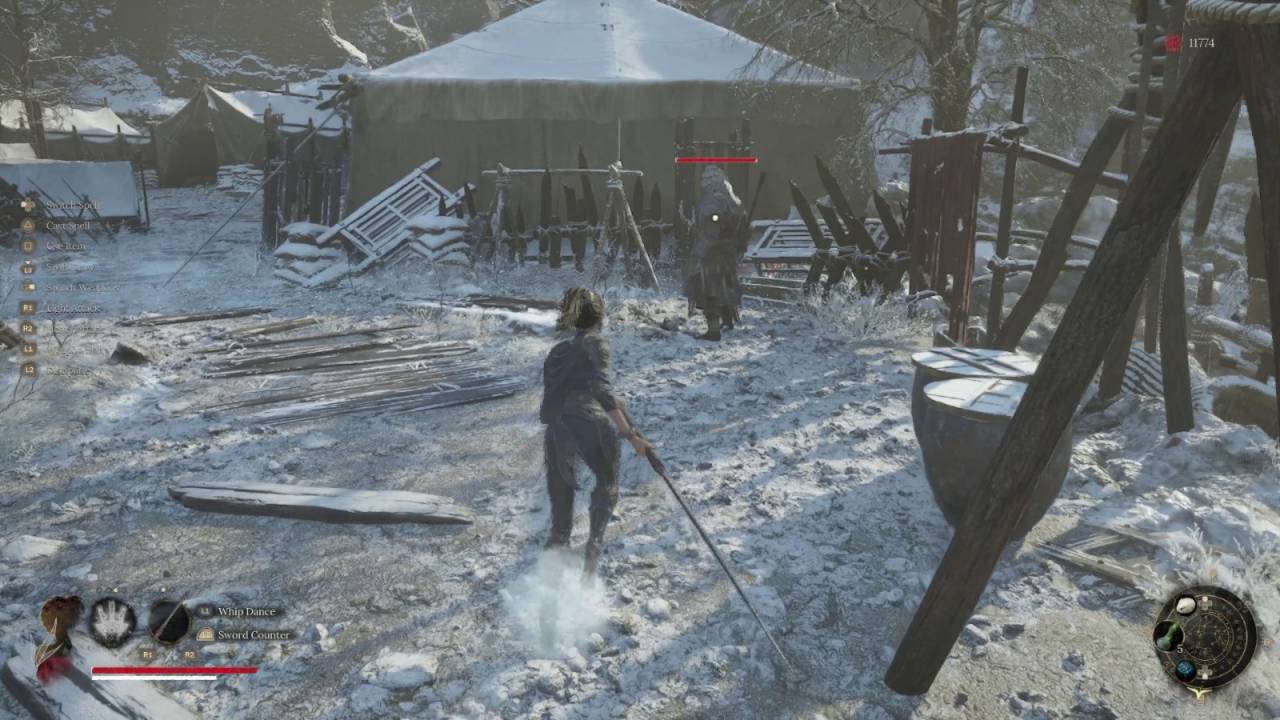 Выйдите из палатки и идите в правую сторону. Вы окажетесь в следующей открытой зоне с палатками. В центре стоят мятежник и разбойник, охраняющие красную ртуть. Будьте осторожны — с другой вышки по вам может стрелять лучник, которого вы пока не можете достать. Уклоняйтесь от его стрел. Следуйте дальше по основному пути к следующему лагерю с палатками. В начале установлен шумовой капкан — обойдите его. Если его активируете, вас атакуют два мятежника, разбойник и собака, а также, возможно, к ним присоединятся жнецы (бросают камни). Если не сработаете капкан, можно устранить врагов по одному. После победы над врагами возьмите 3 порции острого супа у котла и перьевую жемчужину, лежащую возле кучки тел у дрожащих разбойников. С правой стороны от входа в палатку найдите булочку в виде зайца, а сбоку — фонариковый фрукт.
