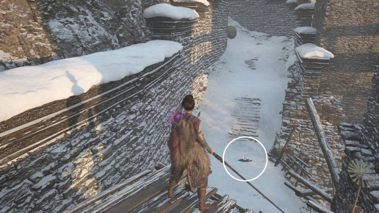Это, разумеется, ловушка. Когда спрыгнете вниз, держитесь левой стены, так как вниз по склону скатится валун. После того как он прокатится мимо, сможете обыскать тело — получите сет брони младшей служанки: шарф, одеяние, поножи. Продолжите движение и победите похитителя. У лестницы, на которую вы вскоре наткнётесь, победите старшую и младшую служанок. Затем поднимитесь по лестнице — она ведёт в следующую локацию, в дворец Снежной крепости.